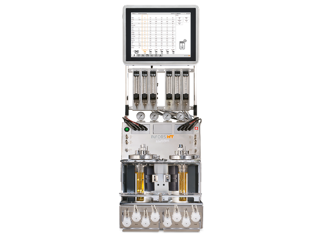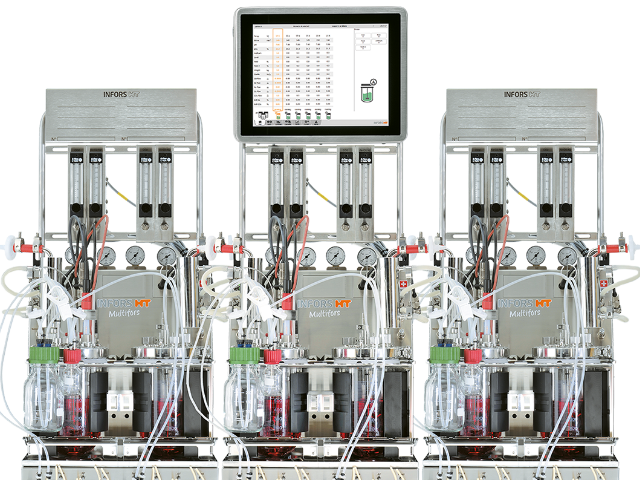 Multifors имеет два реакционных сосуда на одном стенде, что удобно для проведения параллельных исследований и подбора условий культивирования; можно объединять для проведения одновременной ферментации до 3-х аппаратов Multifors (6 сосудов); конструкция ферментера обеспечивает легкий доступ для технического обслуживания.