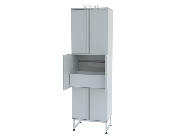 Установка шкафа производится на сборно-разборном каркасе. Каркас покрыт полимерным материалом серого цвета. У него имеются опоры, которые можно регулировать – благодаря им можно скорректировать положение шкафа на неровном полу.
