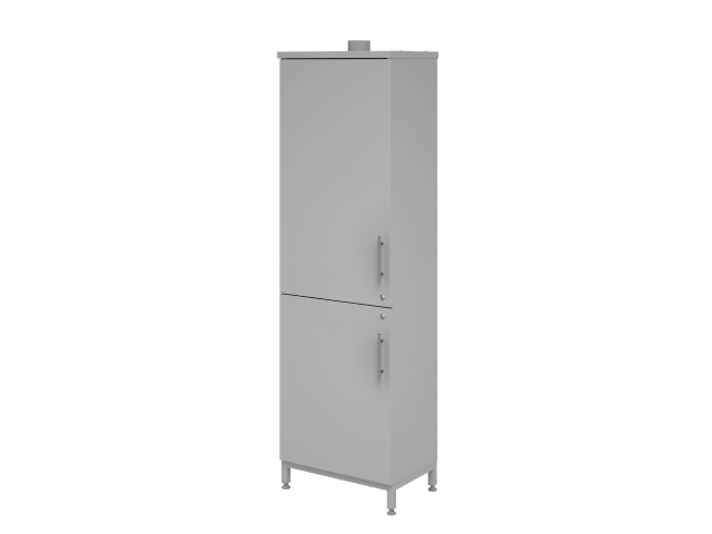 Каждая дверь оборудована замком. Сами дверцы представляют собой глухую объёмную конструкцию из двойной листовой стали. Такая форма надёжно защищает от воздействия химикатов и не даёт проникнуть им наружу в случае ЧП или опрокидывания шкафа. В верхней части корпуса установлен фланец шириной 100 мм для подключения шкафа к вытяжной системе.