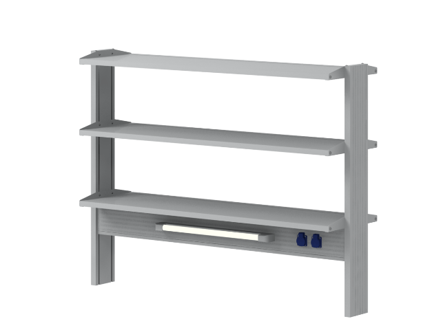 Стеллаж технологически устанавливается на рабочую поверхность островных столов и предназначен для размещения на нем лабораторной посуды, расходных материалов, инструментов, лабораторных приборов и другого лабораторного оборудования и расходных материалов.