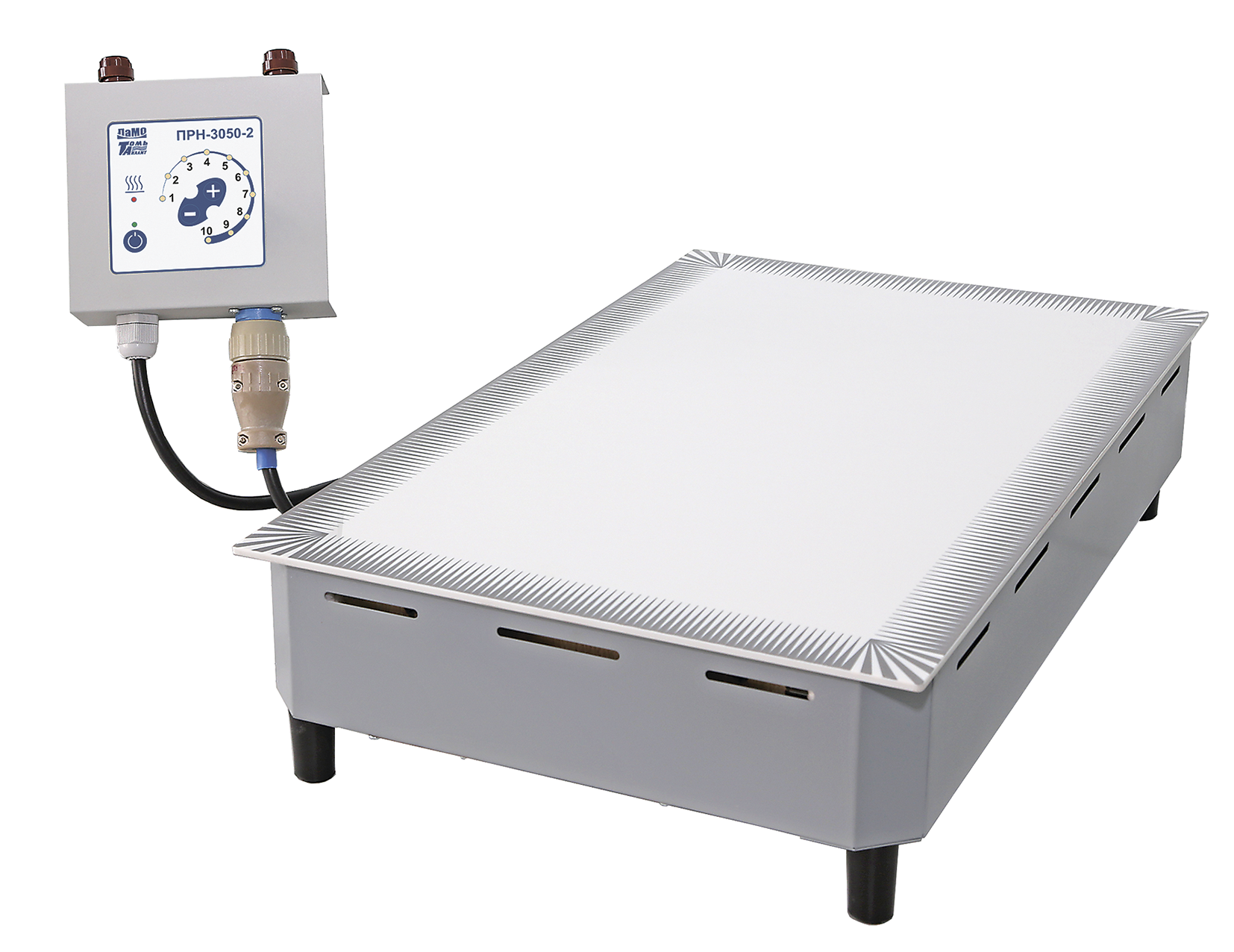 Плита имеет два исполнения: 1) с встроенным блоком управления; 2) с выносным блоком управления. Встроенный блок управления может располагаться по длинной или короткой стороне нагревательной поверхности. Стеклокерамика превосходит по стойкости к концентрированным кислотам и щелочам другие виды покрытий и позволяет обеспечить более быстрый нагрев.