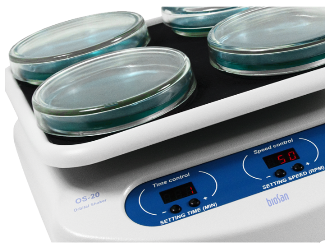 Микропроцессор шейкера обеспечивает контроль времени и оборотов. Предусмотрены два режима эксплуатации шейкера: (1) с таймером (1–999 мин), (2) без таймера, время максимальной эксплуатации в режиме non-stop составляет 24 часа. Пять (5) видов сменных платформ расширяют возможности его использования в различных лабораториях: в микробиологии, химии, иммунологии, биохимии, молекулярной биологии. Двух сантиметровая амплитуда сдвига платформы позволяет равномерно перемешивать жидкости в плоских планшетах при выполнении таких диагностических тестов как VDRL-тест.