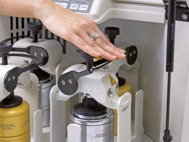 Планетарная мельница PULVERISETTE 5 classic line с 4 размольными местами выдает благодаря особенно высокому приложению энергии размольных шаров быстро и надежно результаты измельчения без потерь твердых, мягких, хрупких и влажных материалов до коллоидальной степени измельчения. Измельчение может производиться в зависимости от желаемой конечной степени измельчения в сухой среде, в суспензии или в атмосфере защитного газа. Помимо измельчения, вы можете использовать планетарные шаровые мельницы также и для смешивания и гомогенизации эмульсий и паст или для механического активирования и легирования в области исследования материалов.
