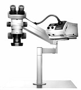 Экономичная модификация с одним плечом. Перемещение по радиусу равному длине плеча, переменный угол наклона корпуса микроскопа, переменный угол наклона плеча. Помимо этого штатив имеет малую штангу вертикально перемещения. Таким образом обеспечивается практически любое желаемое положение микроскопа в пространстве.
