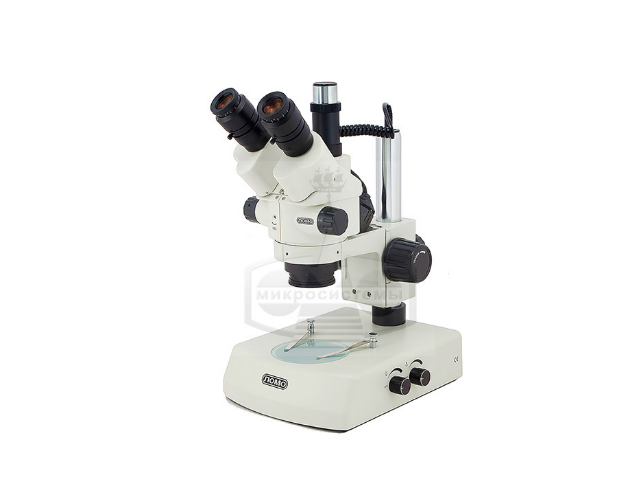 У зум-объектива стереомикроскопа увеличенное до 100 мм рабочее расстояние. У стереомикроскопа два независимых осветителя с регулировкой освещенности.