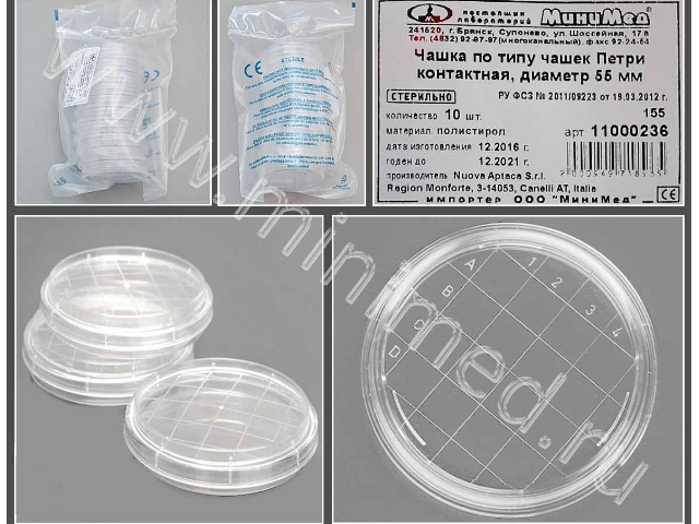 Чашка Петри контактного типа используется для подсчета колоний микроорганизмов. Имеет счетную сетку. Изготовлена из оптического полистирола. Стерилизуется ионизирующим излучением (Бета-лучи). Апирогенна. Вентилируемая.