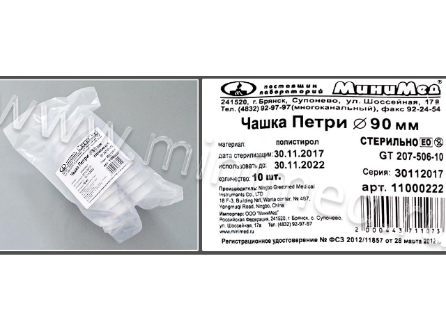 Предназначена для идентификации бактерий на культуральной среде. Чашки Петри стерильные изготовлены из полистирола высокой прозрачности. Чашка Петри имеет специализированные опоры на крышке для аэробного культирования микроорганизмов.