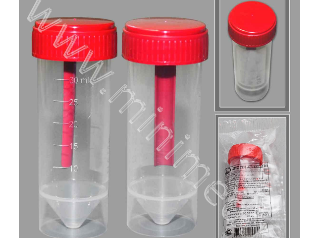 Контейнер с завинчивающейся крышкой и шпателем обеспечивает полную герметичность при транспортировке биологического материала. Материал контейнера - полипропилен, крышки - полиэтилен. Имеет градуировку и матовое окошко для записи. Стерильный.