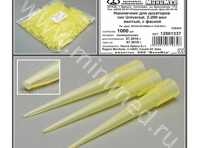 Наконечник для дозаторов 2-200 мкл, Универсальный, желтый, с фаской, уп. 1000шт.