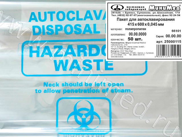 Предназначены для стерилизации в них предметов до 136°С, а также может использоваться для автоклавирования отходов. На пакете имеется логотип Biohazard и белая полоса для записей.
