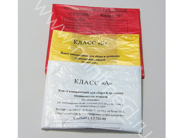 Предназначен для сбора особо опасных отходов: материалов, контактирующих с особо опасными инфекциями, отходов из лабораторий, работающих с микроорганизмами 1-4 групп патогенности, микологических больниц и т.д. На пакете имеется информационное окно для обозначения учреждения, подразделения, даты и фамилии ответственного за сбор отходов лица (поверхность пакета позволяет производить заполнение информационного окна шариковой ручкой). На изделии нанесена ссылка на ТУ, краткая информация о производителе с адресом, контактными телефонами. Плотность пакета 12 мкм. Пакет комплектуется стяжкой.