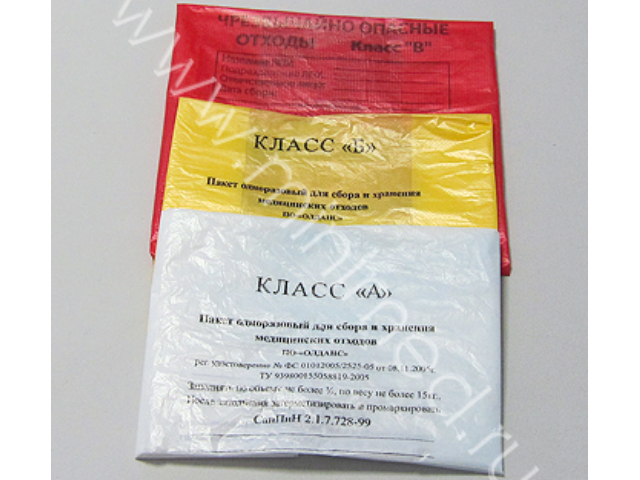 Предназначен для сбора особо опасных отходов: материалов, контактирующих с особо опасными инфекциями, отходов из лабораторий, работающих с микроорганизмами 1-4 групп патогенности, микологических больниц и т.д. На пакете имеется информационное окно для обозначения учреждения, подразделения, даты и фамилии ответственного за сбор отходов лица (поверхность пакета позволяет производить заполнение информационного окна шариковой ручкой). На изделии нанесена ссылка на ТУ, краткая информация о производителе с адресом, контактными телефонами. Пакет имеет боковые складки - фальцы, которые придают ему дополнительный объем при заполнении. Плотность пакета 12 мкм. Пакет комплектуется стяжкой.