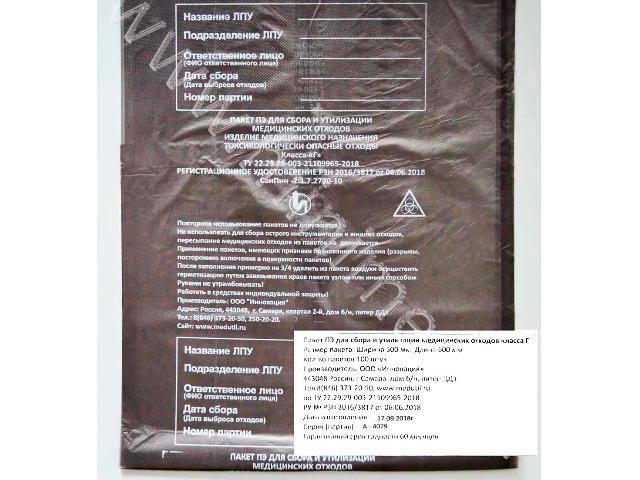 Предназначен для сбора просроченных лекарственных средств, отходов от лекарственных и диагностических препаратов, дез. средств, не подлежащих использованию с истекшим сроком годности, цитостатиков и других химпрепаратов, ртутьсодержащих препаратов, приборов и оборудования. На пакете имеется информационное окно для обозначения учреждения, подразделения, даты и фамилии ответственного за сбор отходов лица (поверхность пакета позволяет производить заполнение информационного окна шариковой ручкой). На изделии нанесена ссылка на ТУ, краткая информация о производителе с адресом, контактными телефонами.