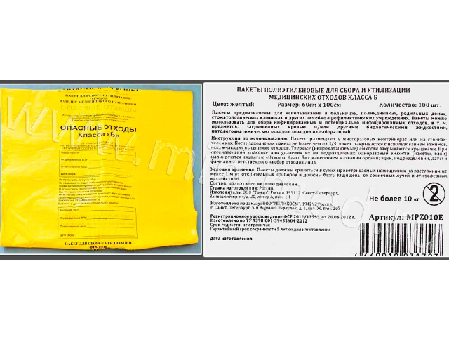 Предназначен для сбора биологически опасных, инфицированных инструментов и материалов, органических отходов (органы и ткани), патологоанатомических и биологических отходов, отходов из микробиологических лабораторий. На пакете имеется информационное окно  для обозначения учреждения,  подразделения, даты и фамилии ответственного за сбор отходов лица (поверхность пакета позволяет производить заполнение информационного окна шариковой ручкой). На изделии нанесена ссылка на ТУ, краткая информация о производителе с адресом, контактными телефонами.