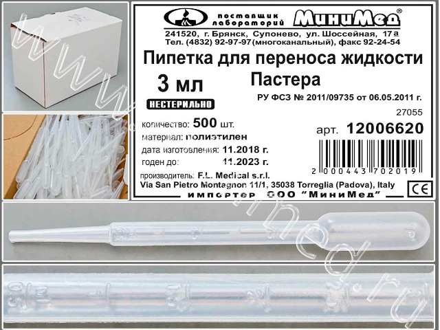 Пипетка для переноса жидкости (Пастера) 3 мл. н/стер.,уп.500 шт.
