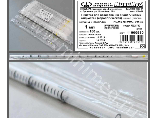 Пипетки серологические, одноразовые, изготовлены из кристаллического полистирола. Стерилизованы гамма-излучением. Цветовая маркировка кодирует соответствующий номинал согласно международным стандартам. Пипетки апирогенны, не обладают гемолитическим и цитоксическими действиями. Градуировка на пипетки нанесена черной, устойчивой к стиранию краской. Пипетки всех номиналов имеют отрицательную шкалу переполнения, продолжающую основную шкалу.