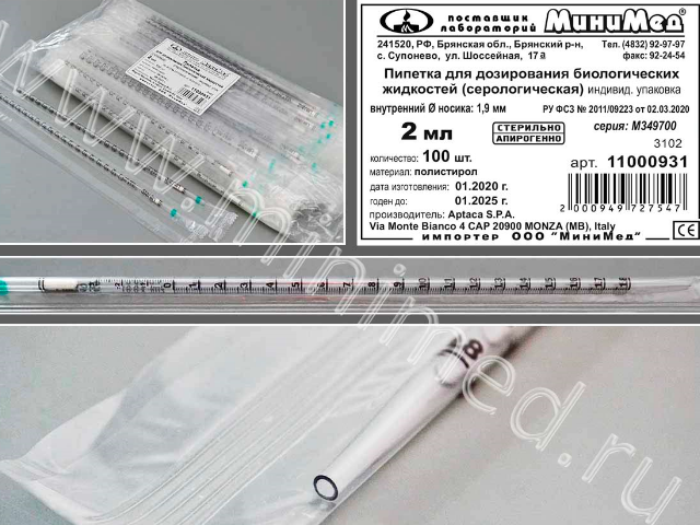 Пипетка д/дозирования биологических жидкостей (серологическая) 2 мл.,стерильная, апирогенно, инд.уп.,уп.100 шт./кор.1000,п/с