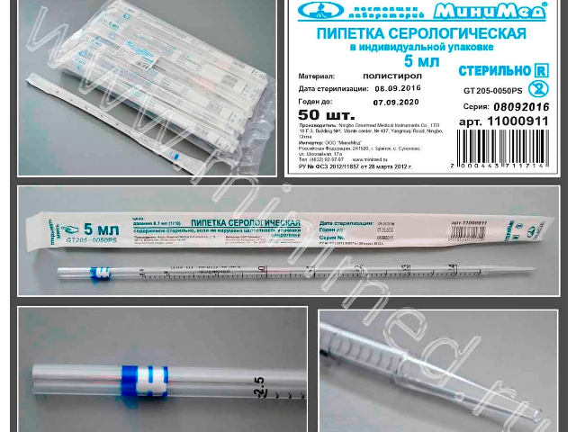 Пипетки серологические, одноразовые, изготовлены из кристаллического полистирола. Стерилизованы гамма-излучением. Цветовая маркировка кодирует соответствующий номинал согласно международным стандартам. Пипетки апирогенны, не обладают гемолитическим и цитоксическими действиями. Градуировка на пипетки нанесена черной, устойчивой к стиранию краской.