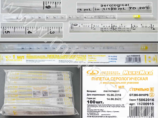 Пипетки серологические, одноразовые, изготовлены из кристаллического полистирола. Стерилизованы гамма-излучением. Цветовая маркировка кодирует соответствующий номинал согласно международным стандартам. Пипетки апирогенны, не обладают гемолитическим и цитоксическими действиями. Градуировка на пипетки нанесена черной, устойчивой к стиранию краской. Пипетки всех номиналов имеют отрицательную шкалу переполнения, продолжающую основную шкалу.