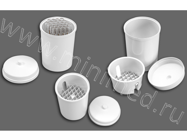 Емкость состоит из корпуса с бортиками сверху для плотного прилегания крышки и вкладыша для установки термометров. Корпус емкости является основной деталью, выполняющей функции стакана. Ячейки вкладыша служат для установки в них термометров и фиксации их в вертикальном положении. Крышка плотно прилегает к корпусу и служит для защиты термометров от повреждений. Допустимая температура воздействия для емкости (75+2)°С. Емкость изготовлена из ударопрочного, химически стойкого, нетоксичного полистирола по ГОСТ 28250. После хранения емкости в холодном помещении или перевозки ee при температуре ниже 10°С перед использованием дать ей прогреться до комнатной температуры в течение 30 минут. После прогревания при комнатной температуре емкость подвергнуть дезинфекции.