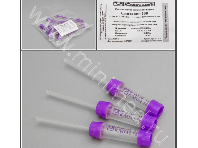 Система взятия капиллярной крови "Синтавет-200" предназначена для взятия капиллярной крови у человека, хранения и транспортировки проб крови в клинико-диагностические и биохимические лаборатории. Область применения-гематологические исследования.