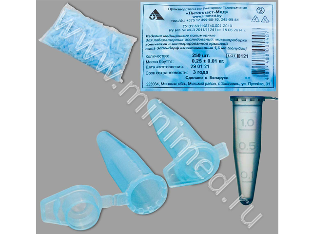 Микропробирка коническая с интегрированной крышкой типа Эппендорф 1,5мл голубая, п/п, уп.250шт