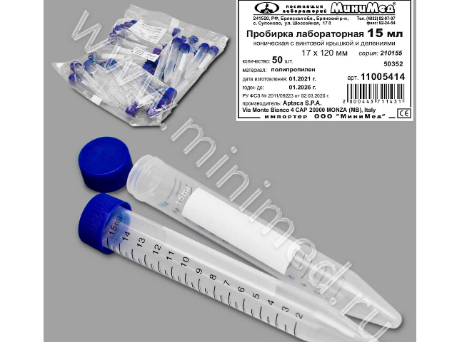 Предназначена для центрифугирования биологических и иных жидкостей. Пробирка коническая 15 мл , изготовлена из полипропилена высокой прозрачности. Герметично завинчивающаяся крышка.
