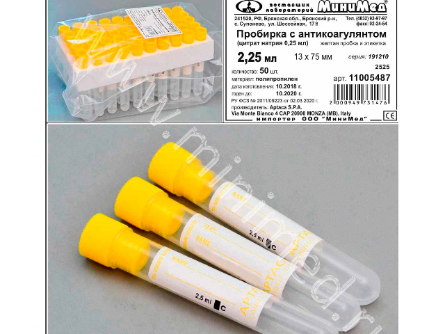 Предназначена для взятия проб крови и её исследования на предмет свертываемости и других патологий. Содержит 0,25 мл антикоагулянта цитрата натрия (3,8%) для 2,25 мл крови. Снабжена этикеткой для маркировки, на которой указана отметка уровня заполнения 2,5 мл (соотношение антикоагулянта и крови 1:9).