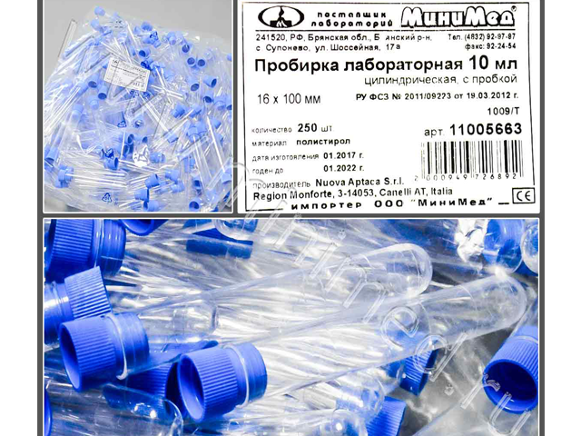 Пробирка предназначена для центрифугирования биологических и иных жидкостей. Изготовлена из полистирола. Снабжена голубой пробкой. Имеет круговую градуировку для определения ориентировочного объема на 1,0-2,5-5,0-10,0 мл. Нестерильная. Относительная центробежная сила, действующая на пробирку, не должна превышать 6500 g.