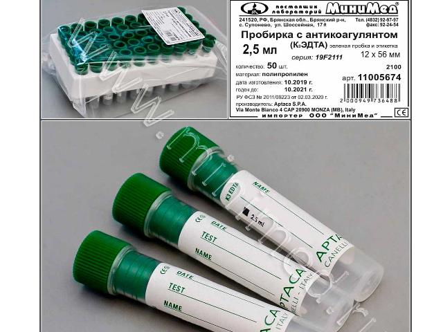 Предназначена для взятия проб крови и её гематологического исследования. Пробирка снабжена этикеткой для занесения информации о проведенном анализе. На этикетке имеется контрольная отметка уровня забираемого образца крови. Нестерильная. Антикоагулянт нанесен на стенки пробирки в виде жидкого аэрозоля в точном соответствии с объемом крови, на который пробирки расчитаны.