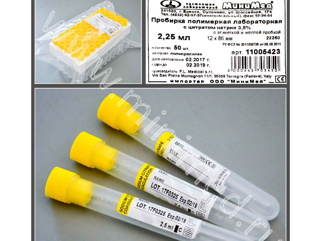 Пробирка снабжена этикеткой для маркировки, на которой указана отметка уровня заполнения 2,5 мл (соотношение антикоагулянта и крови 1:9). Укупорена пробкой желтого цвета. Нестерильная.