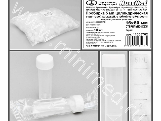 Предназначена для взятия, хранения и транспортировки образцов биоматериалов в целях дальнейших диагностических исследований в клинических лаборатоиях. Изготовлена из полипропилена, герметично укупоривается винтовой крышкой. На пробирках нанесена четкая градуировка и матовое окошко для записи. Относительное центробежное ускорение не более 6000 g.