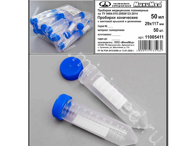 Пробирка коническая без «юбки» устойчивости, предназначена для центрифугирования биологических и иных жидкостей. Пробирка закрывается винтовой крышкой. Деления нанесены белой краской. Так же имеется поле для записи. Пробирка коническая изготовлена из полипропилена, что позволяет автоклавировать ее в стандартном режиме.