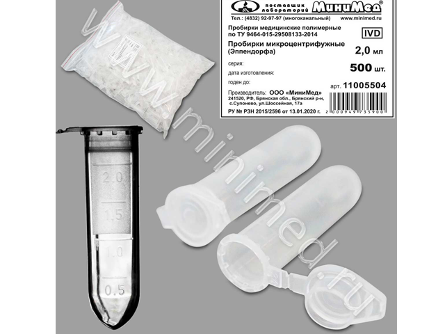 Пробирка микроцентрифужная (Эппендорфа), 2,0 мл, с дел., п/п, уп. 500шт, ТУ 9464-015-29508133-2014