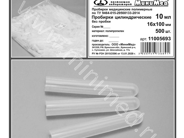 Пробирка цилиндрическая без пробки, 10 мл,16*100 мм, п/п,по ТУ 9464-015-29508133-2014, уп.500шт