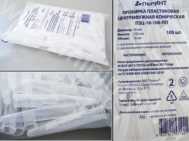 Пробирка предназначена для биологических жидкостей. Изготовлена из полипропилена. Без крышки. Имеет круговую градуировку для определения ориентировочного объема (0,1-0,5-1,0-3,0-5,0-10,0 мл). Относительная центробежная сила, действующая на пробирку, не должна превышать 3000 g.