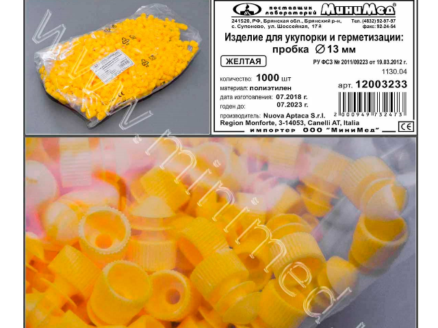 Изделие д/укупорки и герметизации: пробка диам.13 мм, желтые, п/эт,уп.1000 шт.