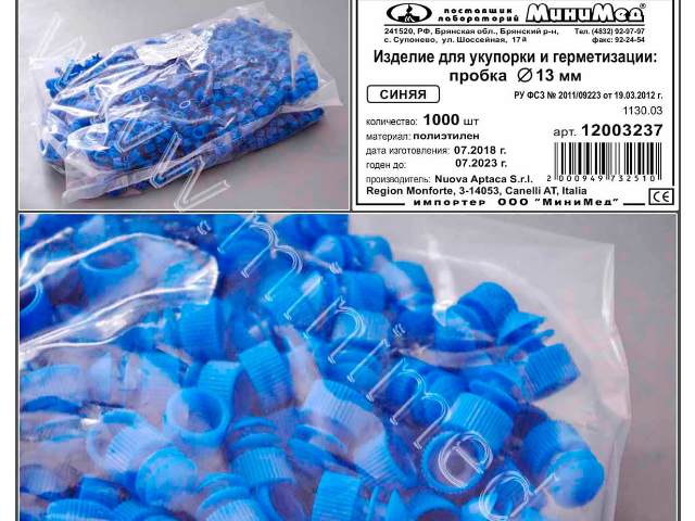Изделие д/укупорки и герметизации: пробка диам.13 мм, синие, п/эт,уп.1000 шт.