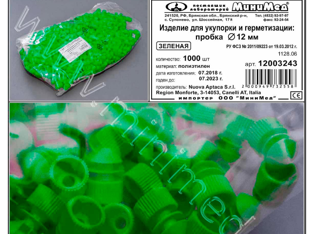 Изделие д/укупорки и герметизации: пробка диам.12 мм, цвет зеленые, п/эт,уп.1000 шт.