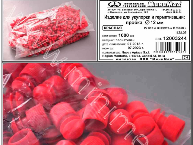 Изделие д/укупорки и герметизации: пробка диам.12 мм, цвет красные, п/эт,уп.1000 шт.