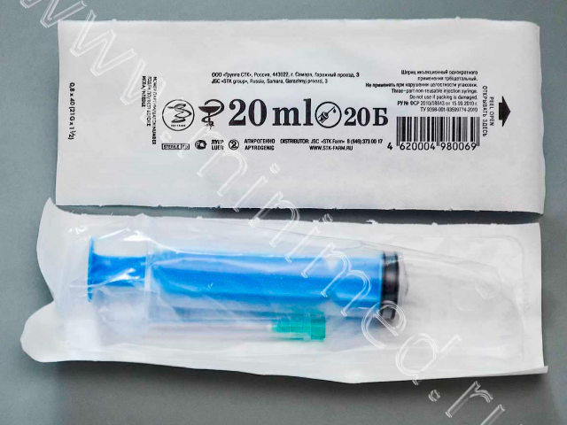 Шприц 20 мл. 3-х компонентный, номинальный объем 20,0 мл, дополнительная градуировка до 24 мл имеет абсолютно прозрачный цилиндр, покрытый силиконовой смазкой. Шток поршня цветоконтрастный (зелёный). Соединение иглы и шприца типа «Luer» эксцентрическое положение наконечника.