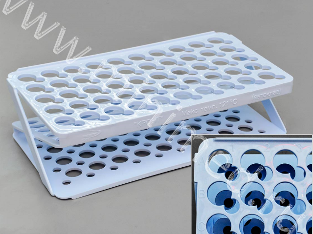 Штатив имеет Z –образную форму, т.е. помимо основных верхнего и нижнего ярусов, имеется третий, расположенный под углом к ним. Дополнительная плоскость повышает надежность фиксации пробирок в штативе.