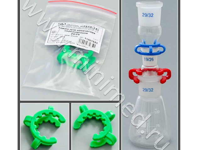 Предназначен для фиксирования стеклянных конических переходников с различными конусами в лабораторных установках. Не царапает стекло. Выдерживает автоклавирование. Имеет различные цветовые исполнения.