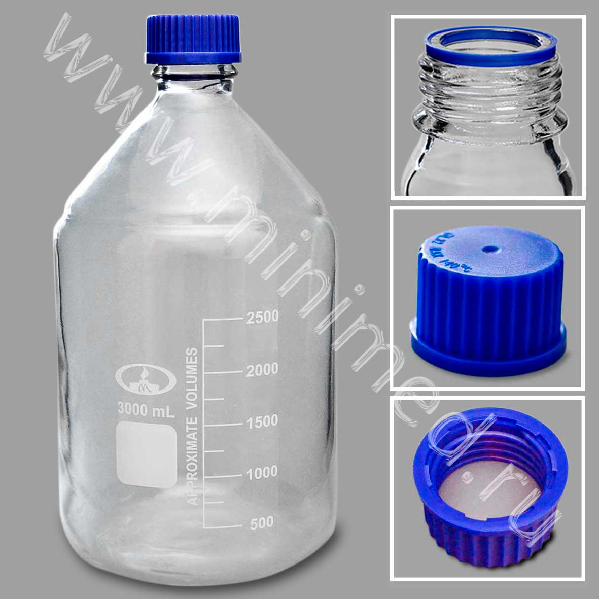 Предназначена для хранения химических реактивов. Изготовлена из химико-лабораторного стекла, крышка изготовлена из полипропилена. На горлышке есть уплотнительное кольцо. Градуированы до 2500 мл.