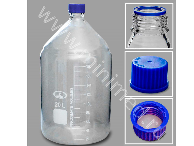 Предназначена для хранения химических реактивов. Изготовлена из химико-лабораторного стекла, крышка изготовлена из полипропилена. На горлышке есть уплотнительное кольцо. Градуированы до 18 л.