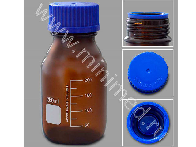 Предназначена для хранения химических реактивов. Изготовлена из янтарного (темного) химико-лабораторного стекла, крышка изготовлена из полипропилена. На горлышке есть уплотнительное кольцо. Градуированы до 200 мл.
