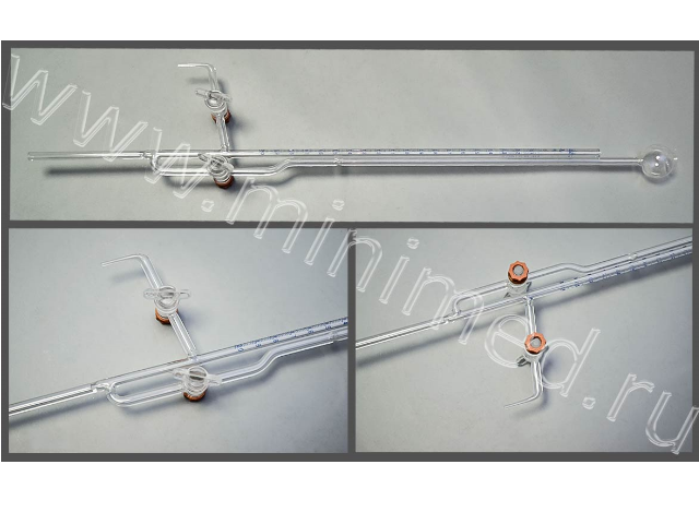 Микробюретка предназначена для титрования и отмеривания небольших количеств жидкости (на объем 1-5 мл). Имеет конусные стеклянные одноходовые пришлифованные краны с резьбовым уплотнением и резервуар для удобства дозаполнения жидкостью.