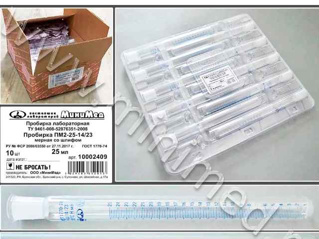 Пробирка лабораторная по ТУ 9461-008-52876351-2008, мерная со шлифом, ПМ2-25-14/23, ГОСТ-1770-74,уп. 10 шт