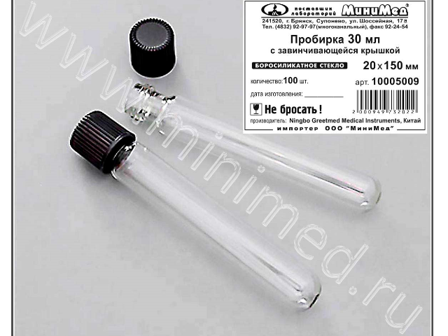 Пробирка с завинчивающейся крышкой разработана для химических, биологических и микробиологических лабораторных процедур. Изготовлена из боросиликатного стекла, крышка из бакелита выдерживает t до 300 град.