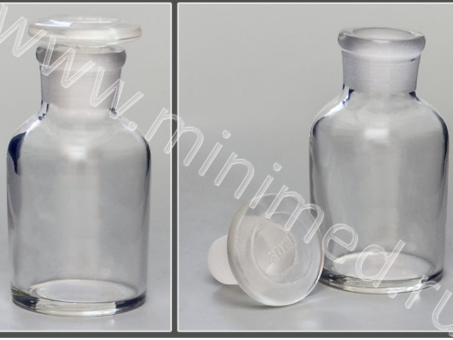 Склянка лабораторная 30 мл из светлого стекла с узкой горловиной и притертой пробкой, кор.144 шт